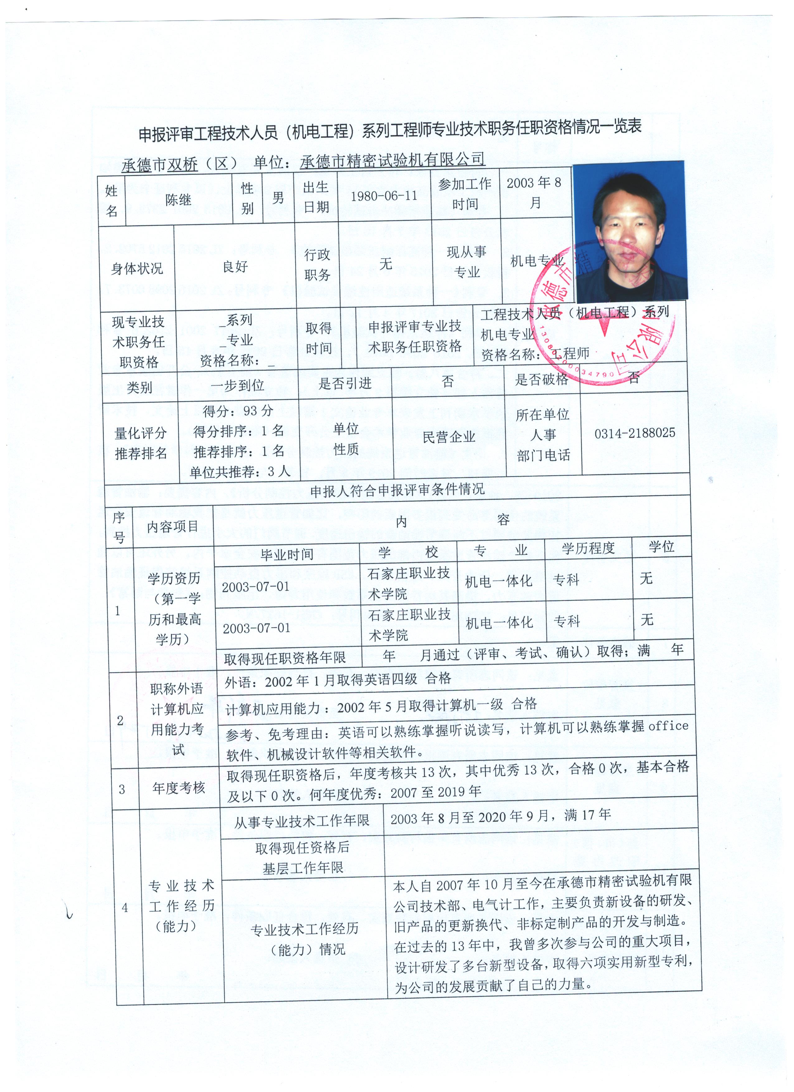 公司推薦在職員工陳繼申報(bào)工程師的公示