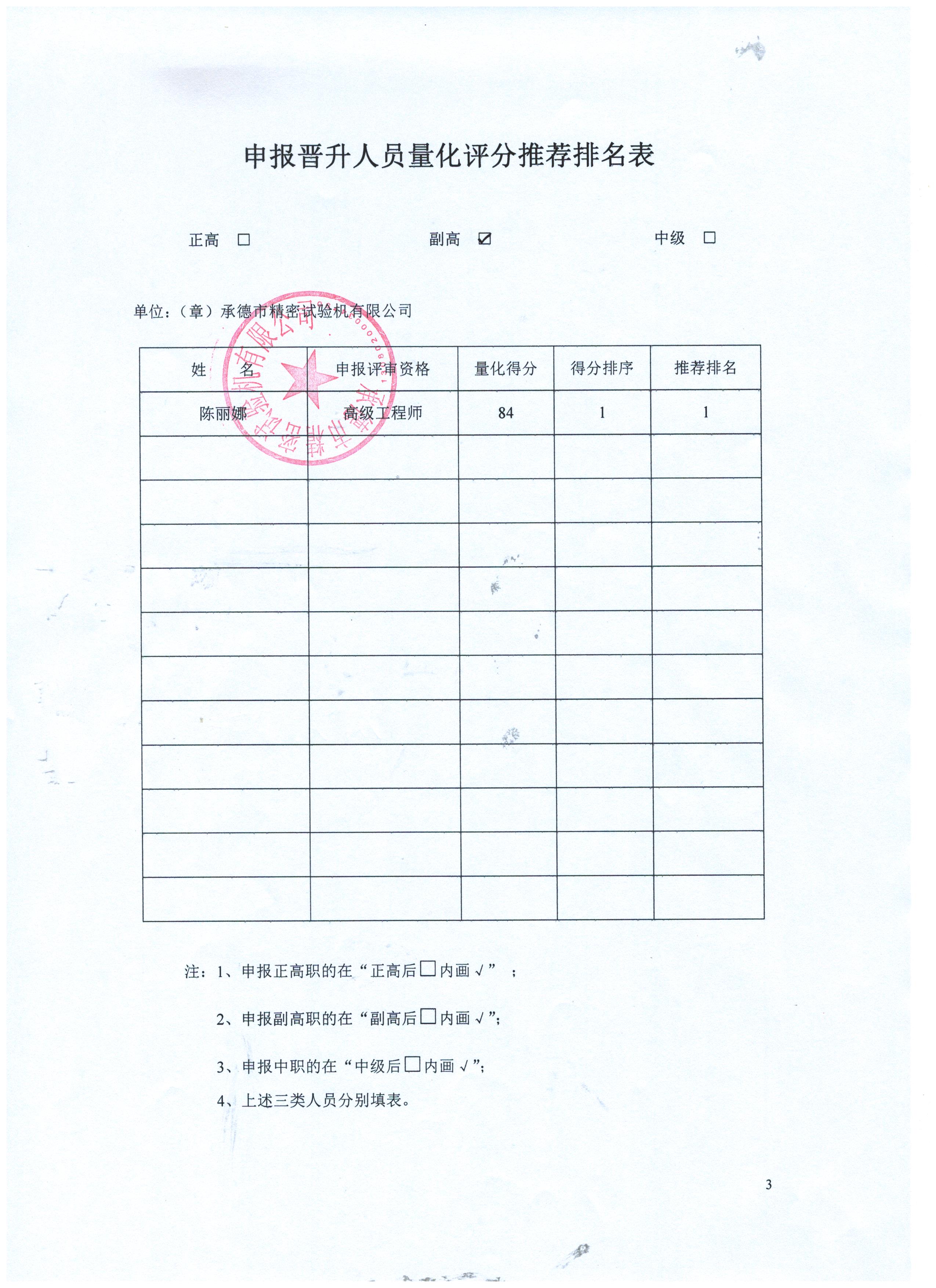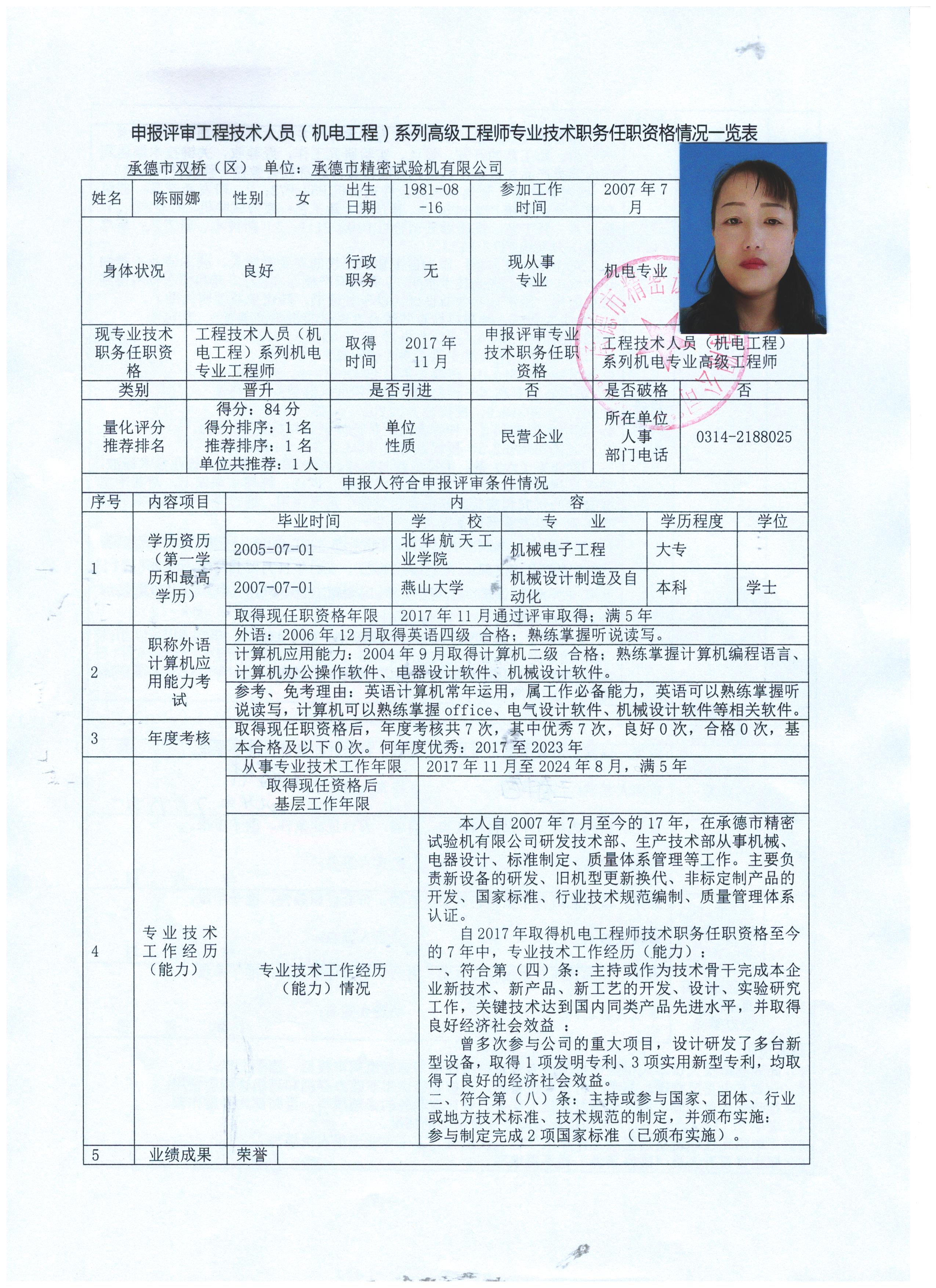 公司推薦在職員工陳麗娜申報高級工程師的公示